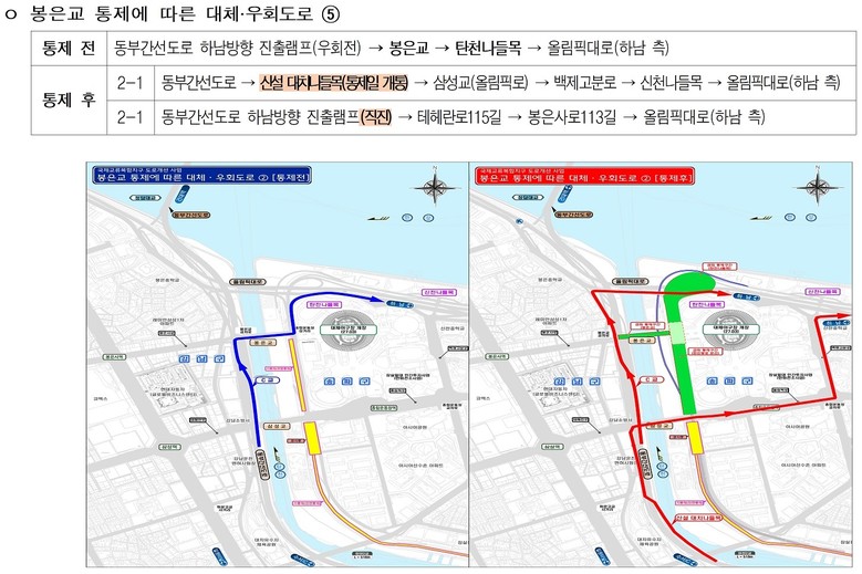 ⑤ 동부간선도로(하남방향) 진출로에서 봉은교·탄천동로를 거쳐 올림픽대로로 진입하던 차량은, 신설·개통되는 대치나들목 진출 후 올림픽로 또는 백제고분로(신천나들목)를 경유하거나, 동부간선도로(하남방향) 진출로를 직진해 테헤란로115길과 봉은사로113길을 이용할 수 있다.