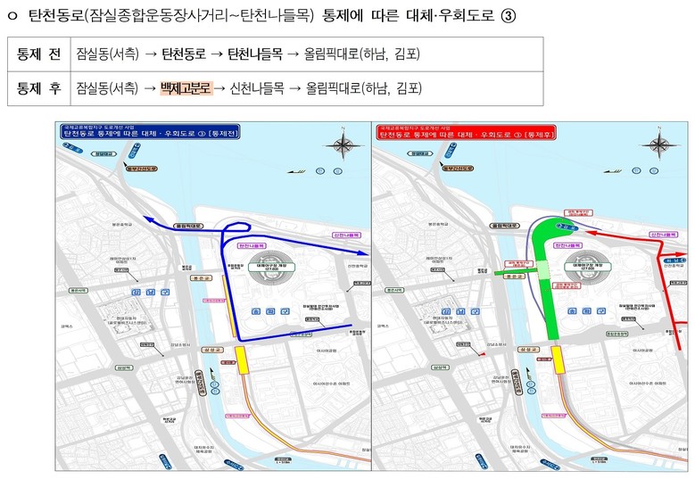 ③ 잠실동에서 탄천동로를 통해 올림픽대로로 진입하던 차량은, 기존 탄천동로(탄천나들목) 대신 백제고분로(신천나들목)를 이용하면 된다.