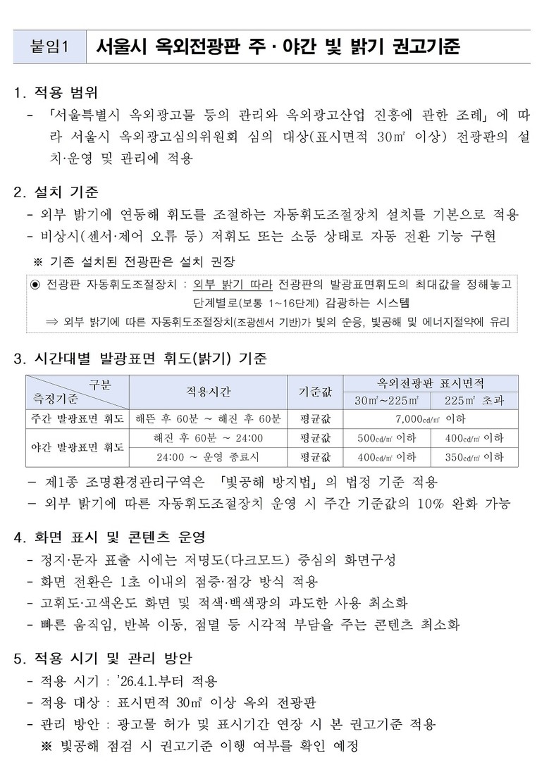 서울시는 전국 최초로 전광판 ‘주간 밝기 기준(7,000cd/㎡ 이하)’을 신설하고 표시면적, 시간대별로 야간 기준을 정교하게 조정한 「옥외전광판 주·야간 빛 밝기 권고기준」을 수립했다고 30일(월) 밝혔다.
