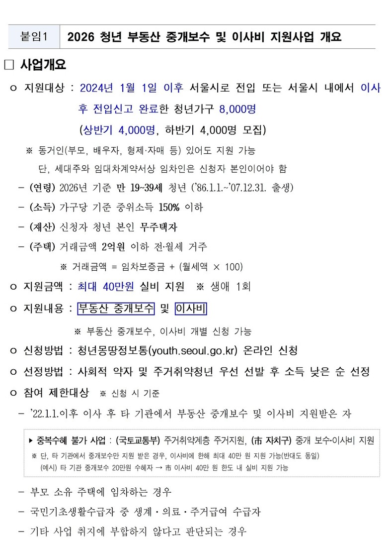 [서울 세계타임즈=이장성 기자] 서울시가 2026년 상반기 ‘청년 부동산 중개보수 및 이사비 지원사업’ 참여자 4,000명을 4월 1일(수)부터 14일(화)까지 모집한다.