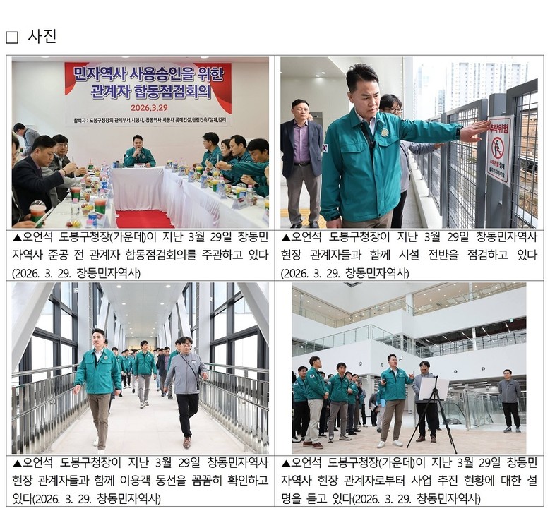 한편 3월 29일 준공 처리 전 오언석 도봉구청장은 부서별 소관 사항 합동점검을 실시했다. 시설 전반에 미비점이 없는지 최종 확인하기 위함으로 이날 오 구청장과 부구청장 이하 국장, 관계 부서장들은 창동민자역사 관계자와 함께 역사 내·외부와 (신설)진‧출입구, 이용객 동선 전반을 점검했다.
