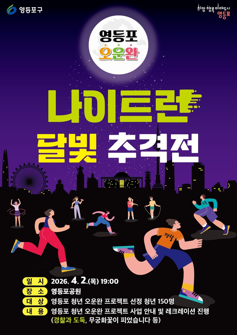 [영등포구 세계타임즈=이장성 기자] 영등포구가 오는 4월 2일 저녁 7시, 영등포공원에서 ‘영등포 오운완 나이트 런(Night Run): 달빛 추격전’을 개최하고, 청년 오운완 프로젝트의 본격적인 시작을 알린다고 밝혔다.