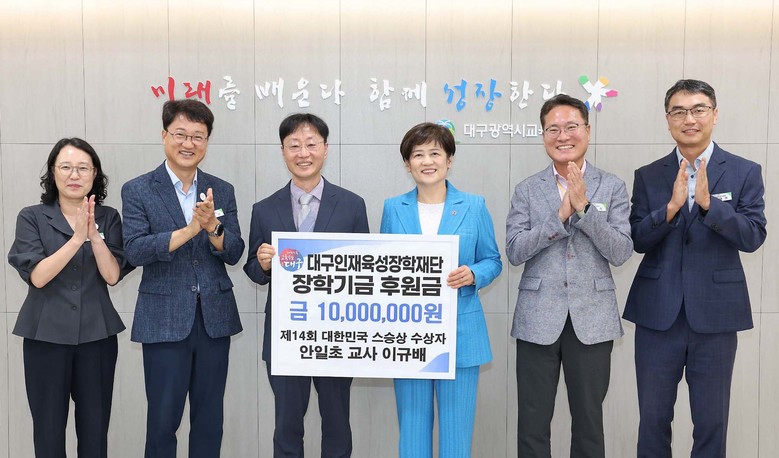 [대구 세계타임즈=한윤석 기자] 대구시교육청(교육감 강은희)은 7월 3일(목), ‘제14회 대한민국 스승상’ 수상자인 대구안일초등학교 이규배 교사가 대구인재육성장학재단에 장학금 1천만 원을 기탁했다고 밝혔다.