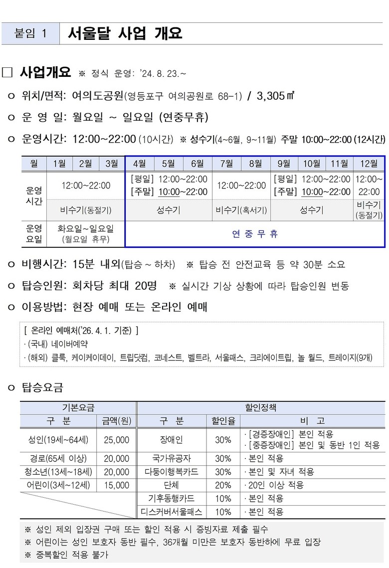 길기연 서울관광재단 대표이사는 “이번 예약 채널 확대와 연중무휴 운영은 전 세계 관광객들이 ‘서울달’을 더욱 친숙하게 경험할 수 있도록 서비스의 경계를 허무는 중요한 계기가 될 것”이라며, “앞으로도 철저한 안전 관리와 차별화된 서비스로 서울을 찾는 모든 이들에게 잊지 못할 하늘 위 추억을 선사하겠다”고 덧붙였다.