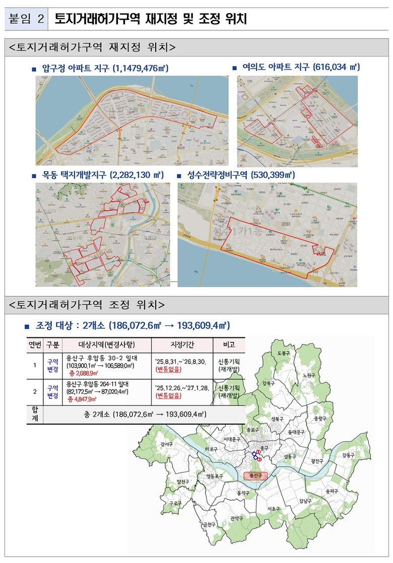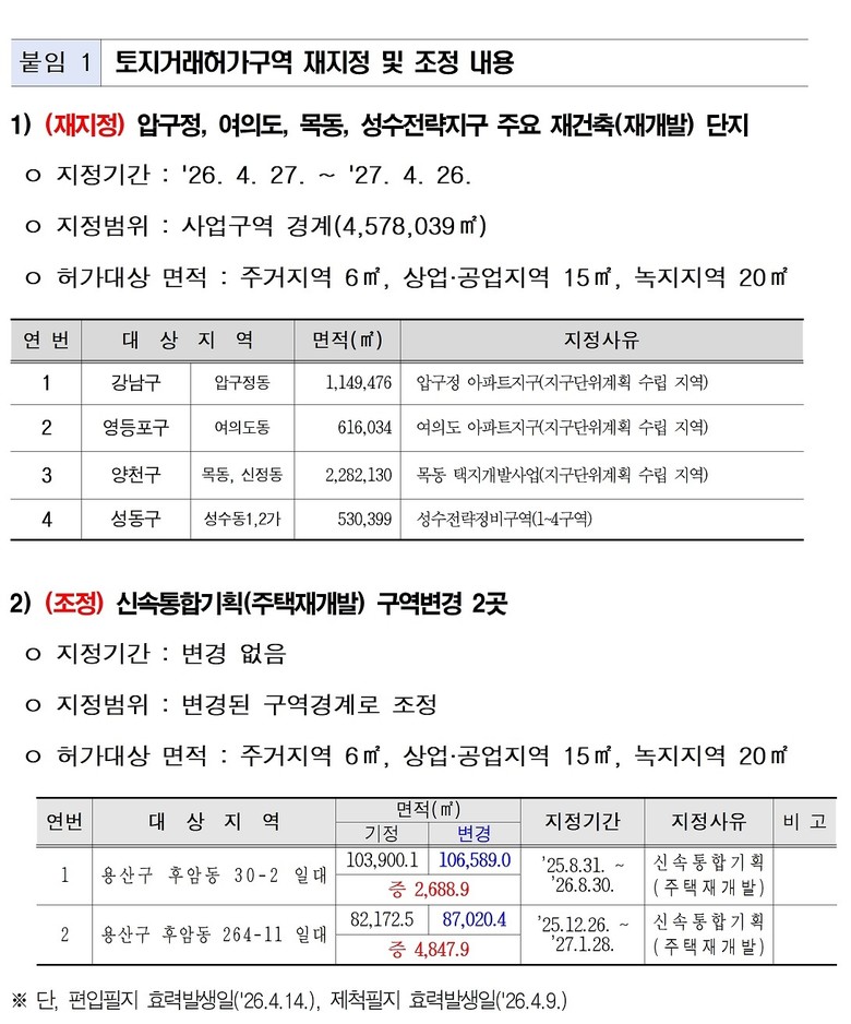 - 압구정·여의도·목동·성수 주요 재건축(재개발) 단지 약 4.6㎢, '27.4.26.까지 1년 '재지정'