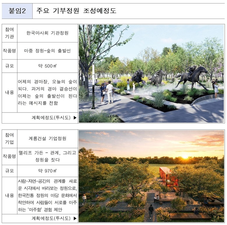 과거 경마장 경주로를 재활용한 순환산책로에는 글로벌 브랜드와 금융권의 참여가 이어진다. 메르세데스벤츠, 천일에너지, AIA생명, 디올, KB증권, 아시아산림협력기구, 신한카드, 신한금융투자, 신세계라이브쇼핑, GS칼텍스, KB국민은행, 포켓몬, 한국수출입은행, 포르쉐코리아, 한국다우, 유한킴벌리, 현대글로비스, 현대위아 등 각 기업의 개성이 담긴 정원들이 산책의 즐거움을 더할 예정이다.