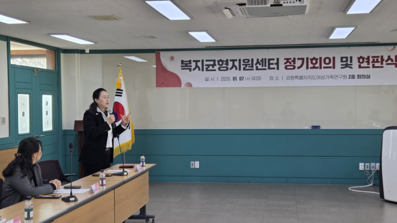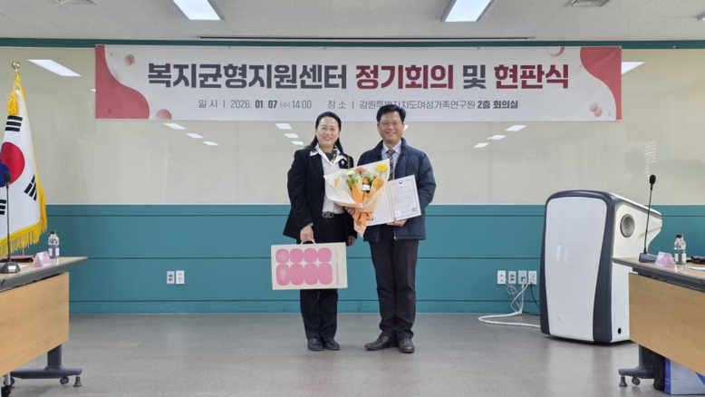 [강원도 세계타임즈=김민석 기자] 강원특별자치도여성가족연구원(원장 김숙영) 복지균형지원센터는 2026년 1월 7일(수), 센터 출범 3주년(1월 9일)을 맞아 ‘복지균형지원센터 유공자 시상 및 현판 제막식’을 개최하였다.